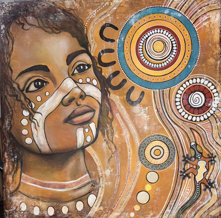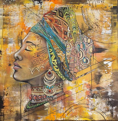 Acryl auf Leinwand, Strukturpaste mit geriffeltem Spachtel, afrikanische Schriftausschnitte (gedruckt), alte Buchseiten, Brush Pens, Goldfolie, Faserstoff,